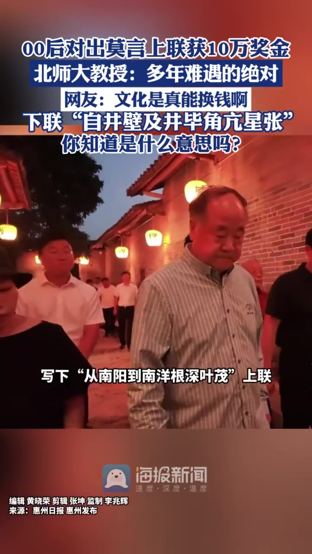 • 主播說丨“00后”對出莫言上聯獲10萬獎金,網友:文化是真能換錢啊